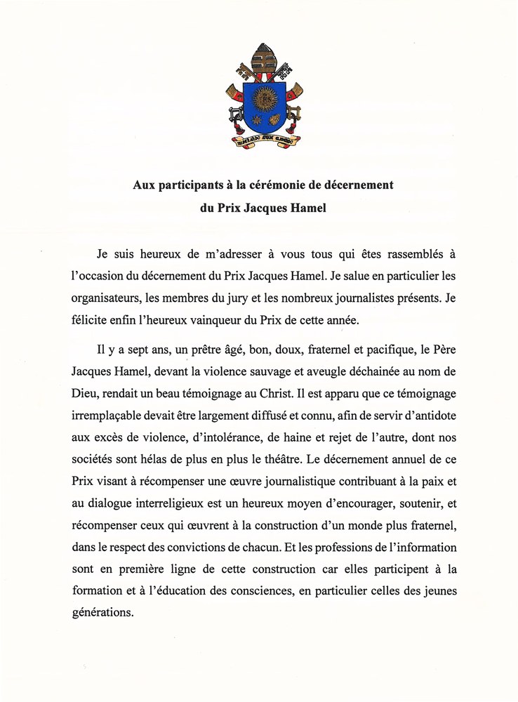 Courrier du Pape François destiné aux participants de la cérémonie de décernement du Prix Jacques Hamel 2024